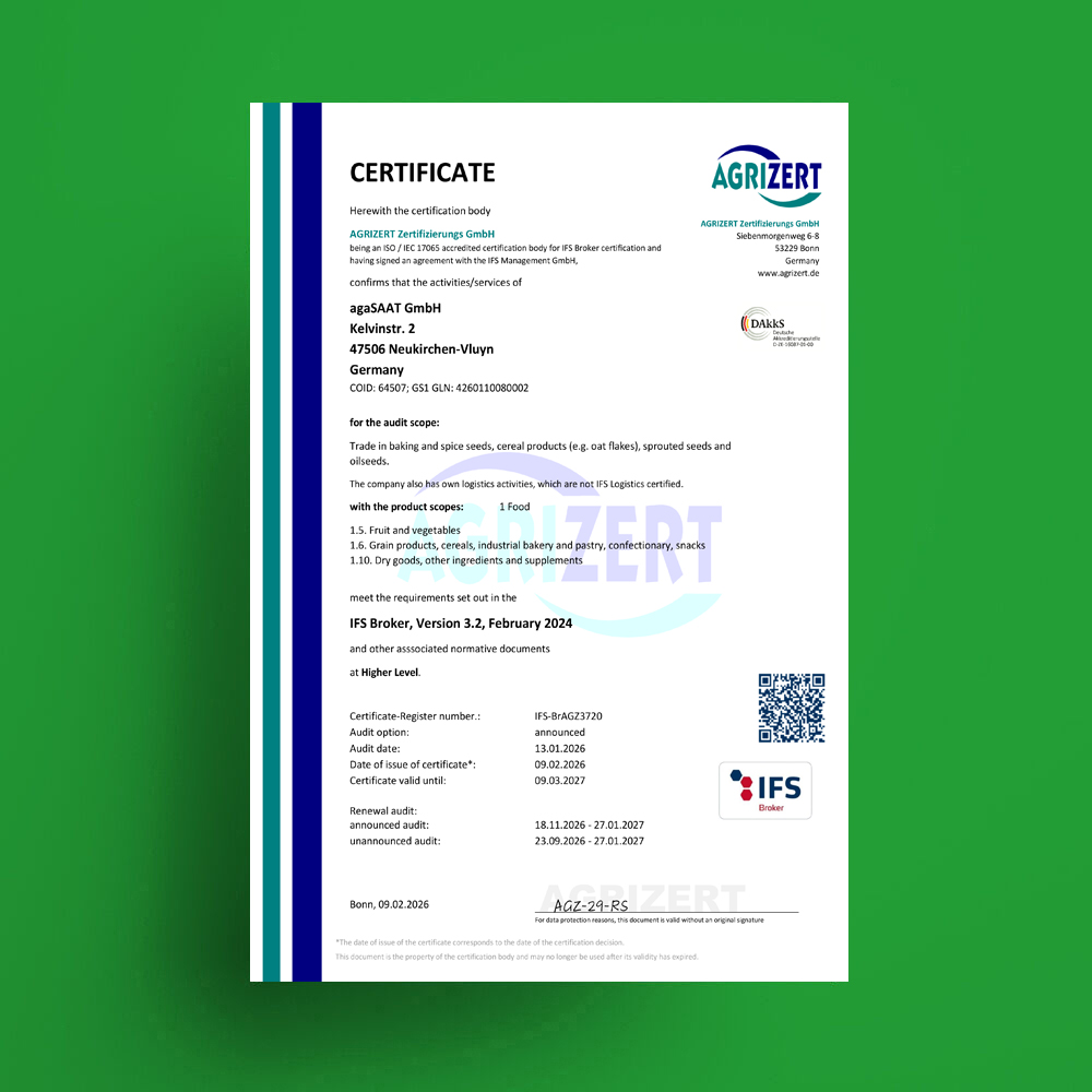 To ensure the high quality of our products, we are subject to strict annual audits. So far, agaSAAT is the only baking seed manufacturer within Germany that is certified by the International Food Standard (IFS). Our organic products comply with the EC regulations on organic production and are annually marked with the organic seal. Since 2016 agaSAAT has the QS certificate.